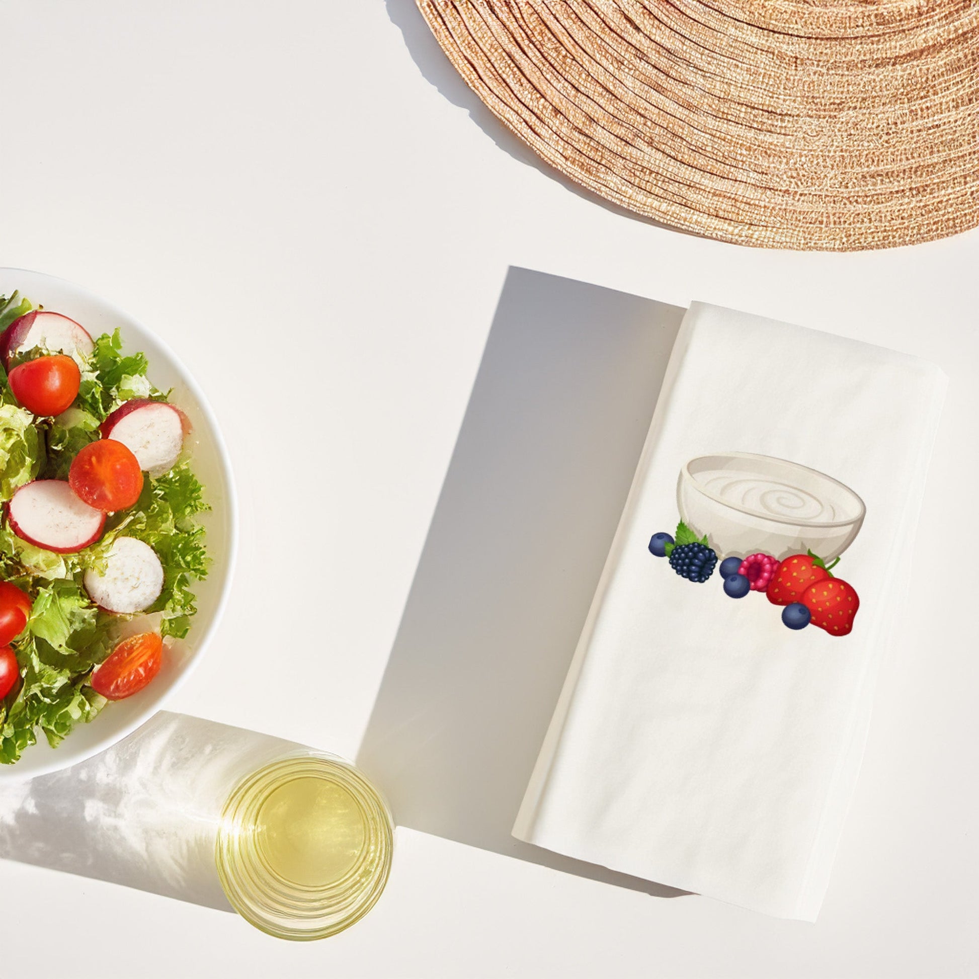 Hafif, sağlıklı ve enerjik bir kahvaltı ruhunu sofralara taşıyan Yoğurt & Berry Bowl Temalı Baskılı Peçete, yoğurt kabı önünde çilek, yaban mersini, frambuaz ve böğürtlen illüstrasyonlarıyla fresh ve modern bir görünüm sunar. Özellikle healthy breakfast, fit menü, smoothie bowl, detox kahvaltı konseptlerine birebir uyum sağlar.