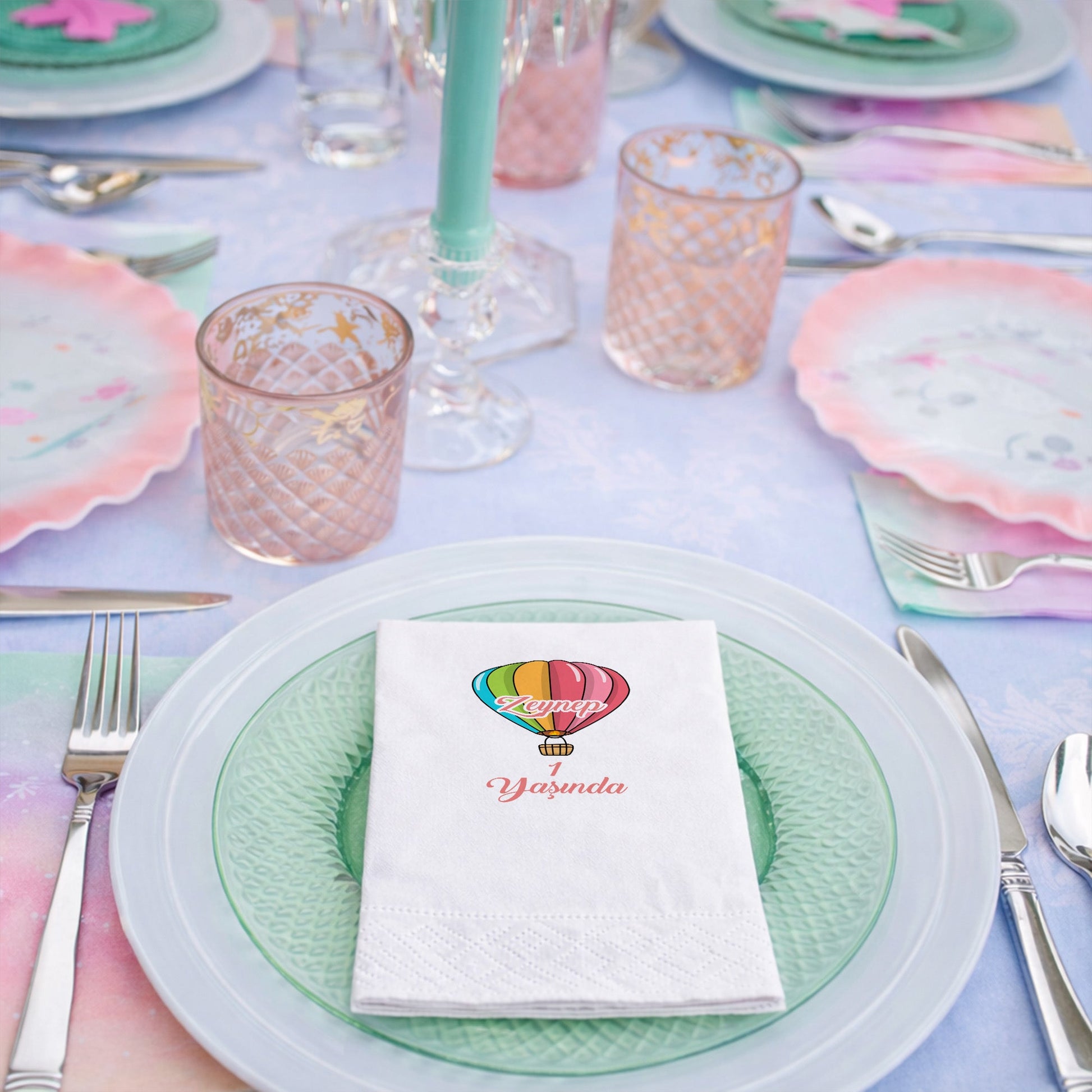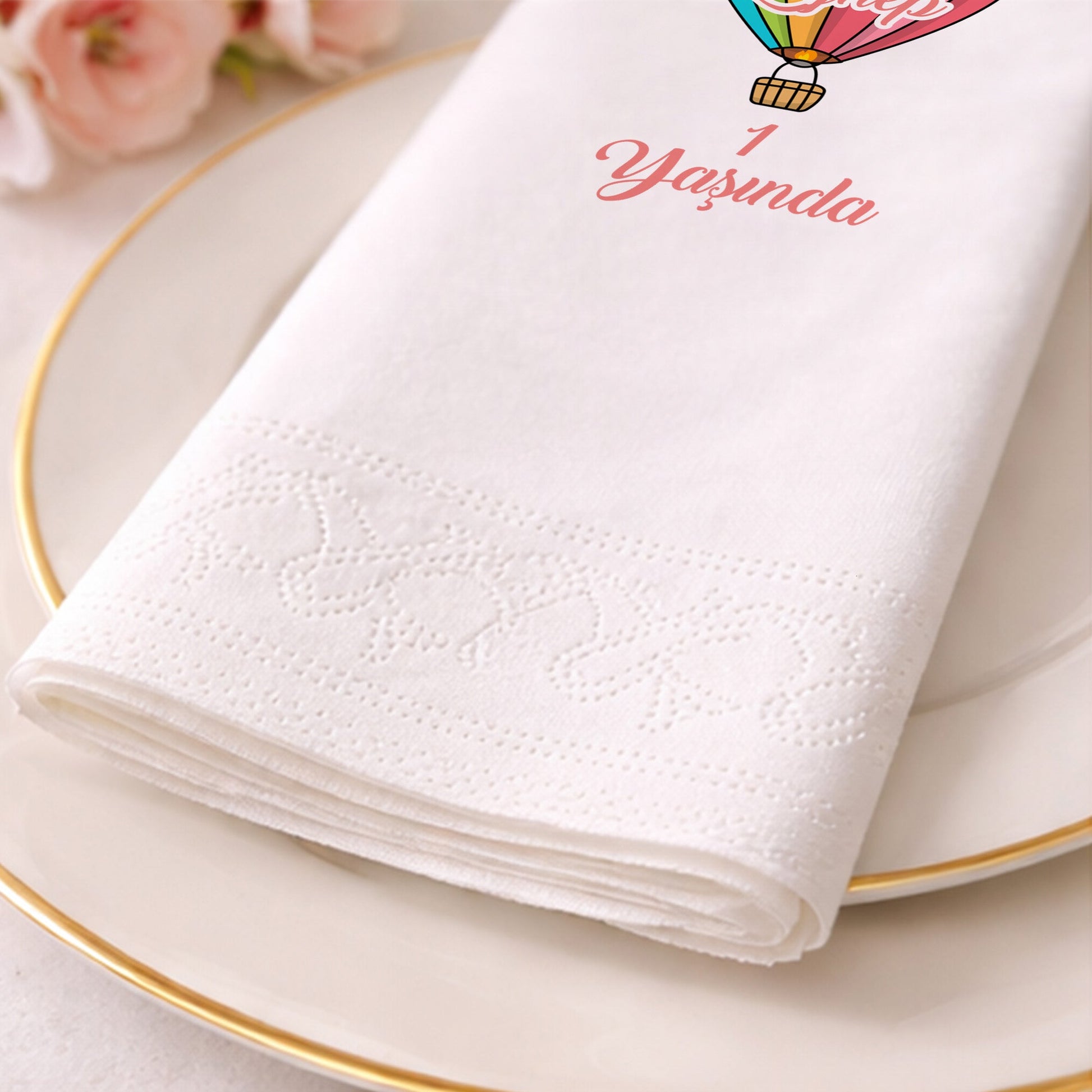 Zeynep’in 1. yaş kutlaması için tasarlanan bu peçete, gökyüzünün özgürlüğünü temsil eden devasa ve renkli bir uçan balon illüstrasyonuna sahiptir. Yumuşak gri zemin üzerine pembe yazı detaylarıyla dengelenen tasarım, zarif bir görünüm sunar. Uçan balon teması, baby shower ve ilk yaş günü partileri için en popüler seçimlerden biridir. Yüksek emicilik ve yumuşak dokusuyla kaliteli bir kullanım sunarken, görsel olarak masaya derinlik katar. Küçük Zeynep’in bu özel gününde, misafirlerinize sunacağınız bu peçeteler şıklığın simgesi olacak. Masal gibi bir doğum günü atmosferi yaratmak isteyenler için ideal bir parçadır.
