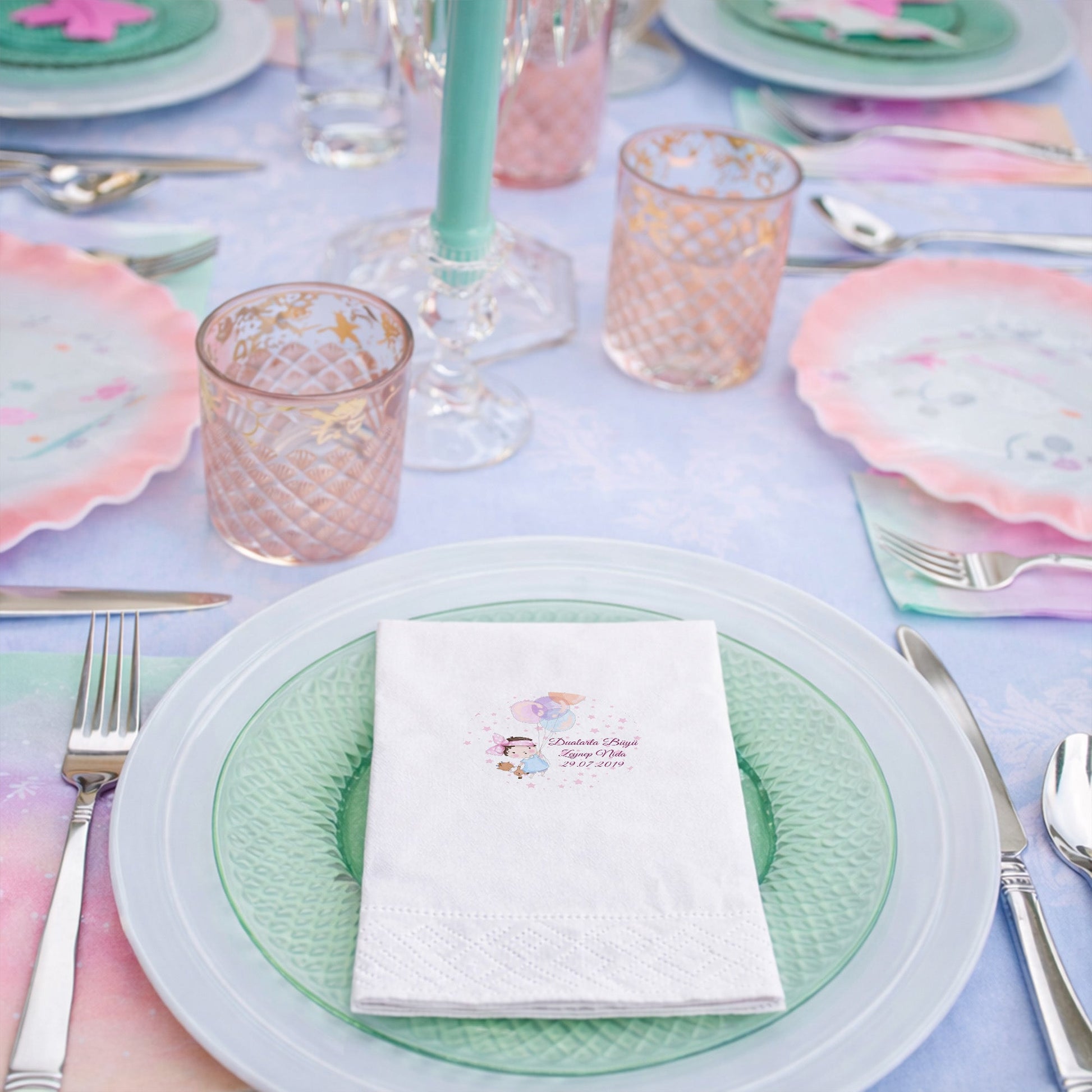 Pembe yıldızlarla süslenmiş bir gökyüzünde, elinde oyuncak ayısıyla uçan balonlara tutunan sevimli kız figürü, Zeynep Nida’nın özel gününe sihirli bir dokunuş katıyor. "Dualarla Büyü" mesajıyla manevi bir derinlik kazanan bu tasarım, özellikle bebek mevlidi, diş buğdayı ve ilk yaş günü kutlamaları için çok tercih ediliyor. Dairesel formdaki bu zarif illüstrasyon, soft renk paletiyle sofralarınızda sakin ve estetik bir duruş sergiler. Kaliteli baskısı sayesinde detayların netliği göz doldururken, peçetenin yumuşaklığı kullanıcı konforunu ön planda tutar. Kişiye özel isim ve tarih baskısıyla hazırlanan bu ürün, davetinizin konseptini güçlendirir ve masanızdaki diğer dekoratif öğelerle mükemmel bir görsel uyum yakalar.