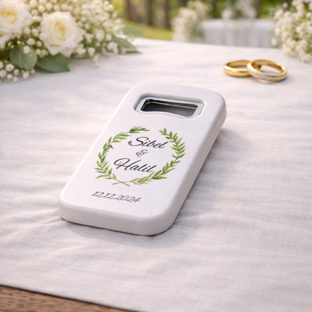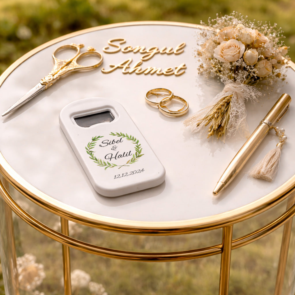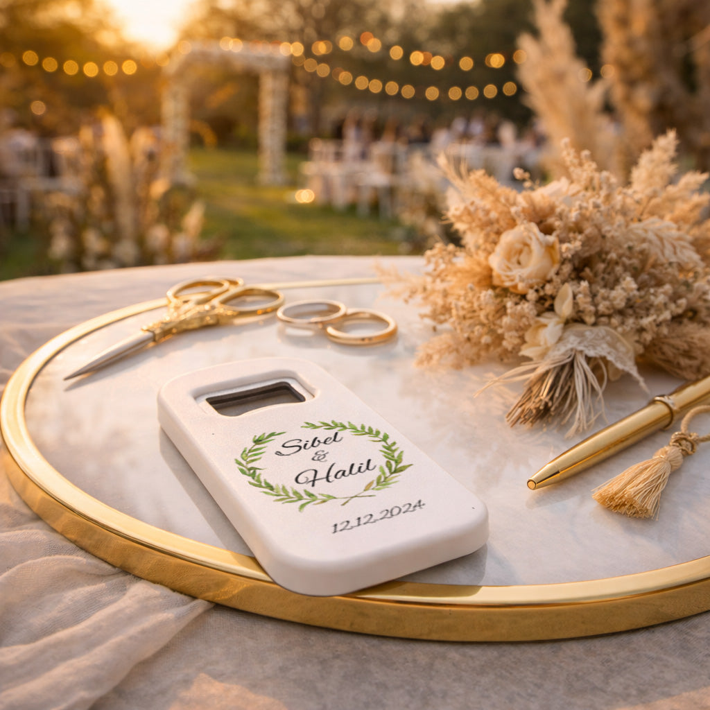 Doğal zarafetin en sade ve şık haliyle tasarlanan bu özel magnet açacak, zeytin dalı çelenk formu ile huzur, birlik ve sadeliği simgeleyen estetik bir görünüm sunar. Daire formunda tasarlanan yaprak çerçeve, minimal ve dengeli bir tasarım oluştururken özellikle doğal, sade ve zarif düğün, nişan ve söz konseptleriyle mükemmel uyum sağlar. Yeşilin yumuşak tonları ile hazırlanan bu tasarım, abartıdan uzak ama etkileyici bir şıklık sunar. Kişiye özel UV baskı teknolojisi ile uygulanan isim ve tarih detayları, net ve canlı görünümünü uzun süre koruyarak bu özel günü kalıcı bir hatıraya dönüştürür.